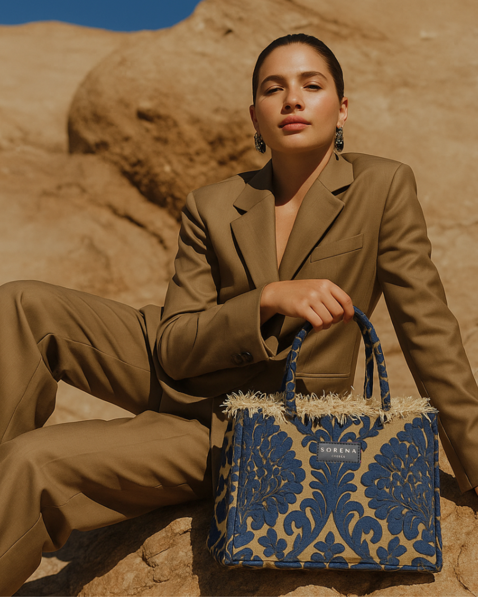 Die LETICIA Tote Bag von SORENA GREECE ist ein elegantes Statement für Frauen, die Mode mit Persönlichkeit tragen. Ihr kunstvolles florales Muster in tiefem Blau auf einem natürlichen beigen Hintergrund erinnert an mediterrane Textilkunst – feminin, kraftvoll und absolut zeitlos.